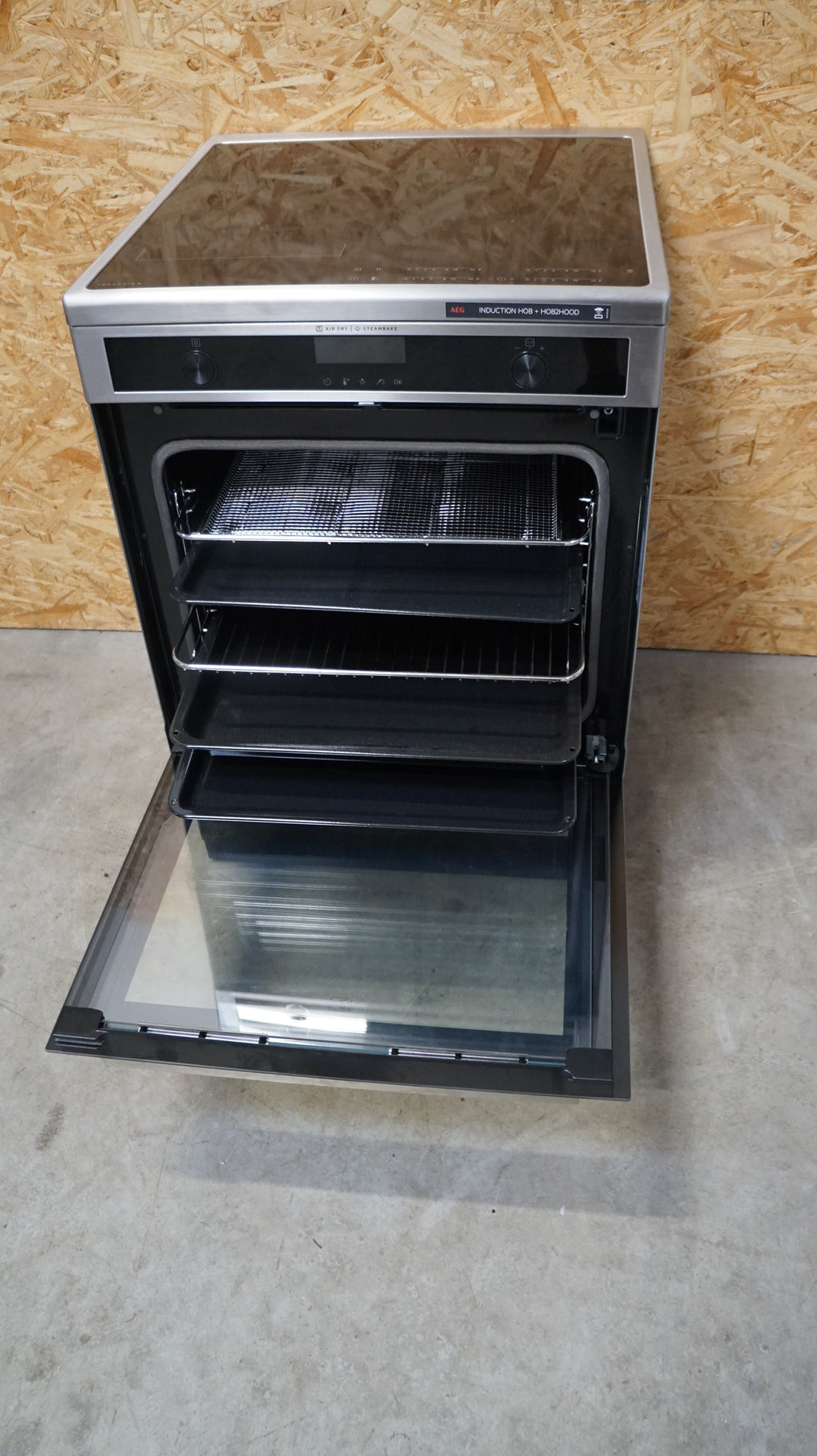 AEG Induktionskomfur med pyrolyse (selvrens) SteamBake med en en 73-liters ovn. Ovnen har en blødt lukkende ovndør, der holder sig på en sikker temperatur. Dette er takket være køleblæseren, der tænder med ovnen og køler dens elektroniske komponenter og eksterne dele. Dine bageplader og andet tilbehør kan du til gengæld opbevare i den praktiske opbevaringsskuffe, der er placeret under ovnen.