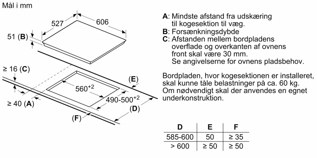 - Krævet niche-størrelse til installation (HxBxD mm): 51 x 560 x (490 - 500)