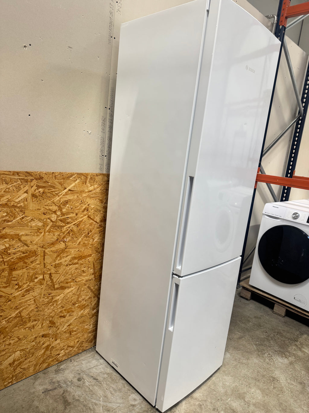Brugt køle/fryseskab med 24 mdr. garanti: brugt Bosch køle/fryseskab med højde på 201 cm. med 249 ltr. køle- og 94 ltr. frysekapacitet. Pænt og lydsvagt nyere køleskab, med enkelte brugsspor. Bemærk venligst: En meget lille ridse/bule på øverste og nederste låge. Du er altid velkommen til at besigtige produkterne på vores lager i Glostrup inden køb.