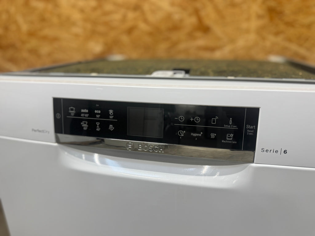 Brugt opvaskemaskine med 24 mdr. garanti – brugt Bosch Serie 6 opvaskemaskine med Zeolith tørring og plads til 14 standard kuverter. Flot maskine, med enkelte brugsspor. Bemærk venligst: Et par ridser på fronten. Du er altid velkommen til at besigtige produkterne på vores lager i Glostrup inden køb