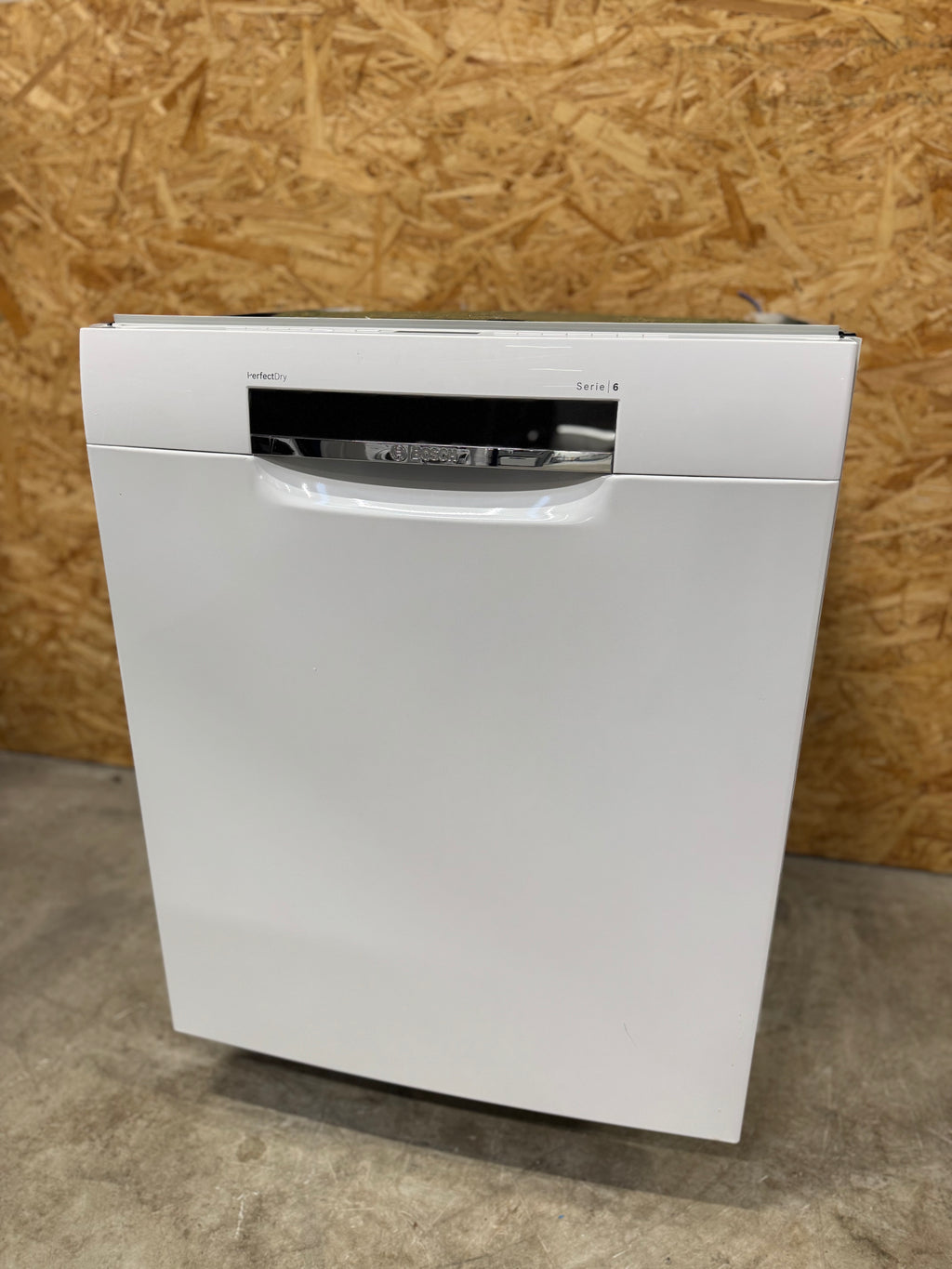 Brugt opvaskemaskine med 24 mdr. garanti: brugt Bosch Serie 6 opvaskemaskine med plads til 13 kuverter og HomeConnect Wi-Fi. Flot og velholdt nyere opvaskemaskine, uden ret mange brugsspor. Bemærk: lille ridse øverst på lågen. Du er altid velkommen til at besigtige produktet på vores lager i Glostrup inden køb.