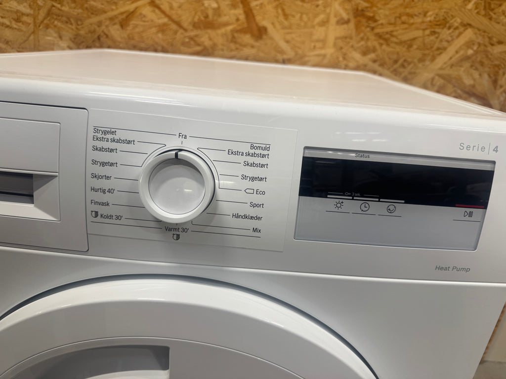 Brugt tørretumbler med 24 mdr. garanti – brugt Bosch Serie 4 kondens tørretumbler med 7 kg. kapacitet og varmepumpe teknologi. Flot tørretumbler med minimale brugsspor. Du er altid velkommen til at besigtige produkterne på vores lager i Glostrup inden køb
