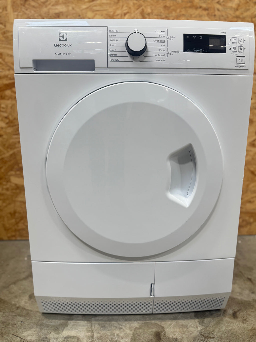 Brugt tørretumbler med 24 mdr. garanti – brugt Electrolux kondens tørretumbler med varmepumpe og 7 kg. kapacitet. Flot nyere tørretumbler, med få brugsspor. Bemærk: En lille utydelig ridse på lågen. Du er altid velkommen til at besigtige produktet på vores lager i Glostrup inden køb.