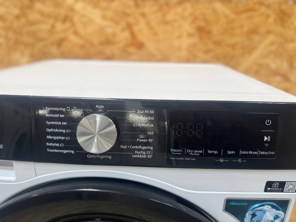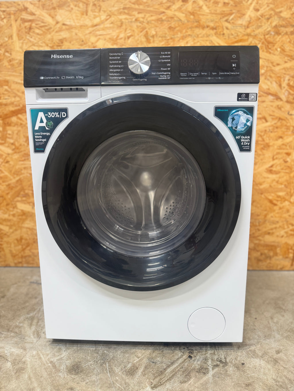 Brugt vaske-tørremaskine med 24 mdr. garanti: brugt Hisense vaske-tørremaskine med 8 kg. vaske- og 5 kg. tørrekapacitet, samt 1400 o/min. centrifugering og dampfunktion. Flot nyere maskine uden nævneværdige brugsspor. Du er altid velkommen til at besigtige produktet på vores lager i Glostrup inden køb.
