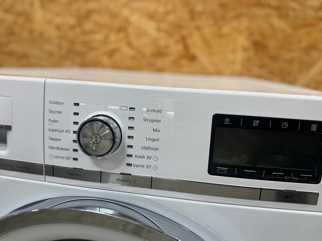 Brugt tørretumbler med 24 mdr. garanti – brugt Siemens iQ800 kondens tørretumbler med 9 kg. kapacitet og varmepumpe teknologi. Flot kvalitetsmaskine med få brugsspor. Du er altid velkommen til at besigtige produktet på vores lager i Glostrup inden køb
