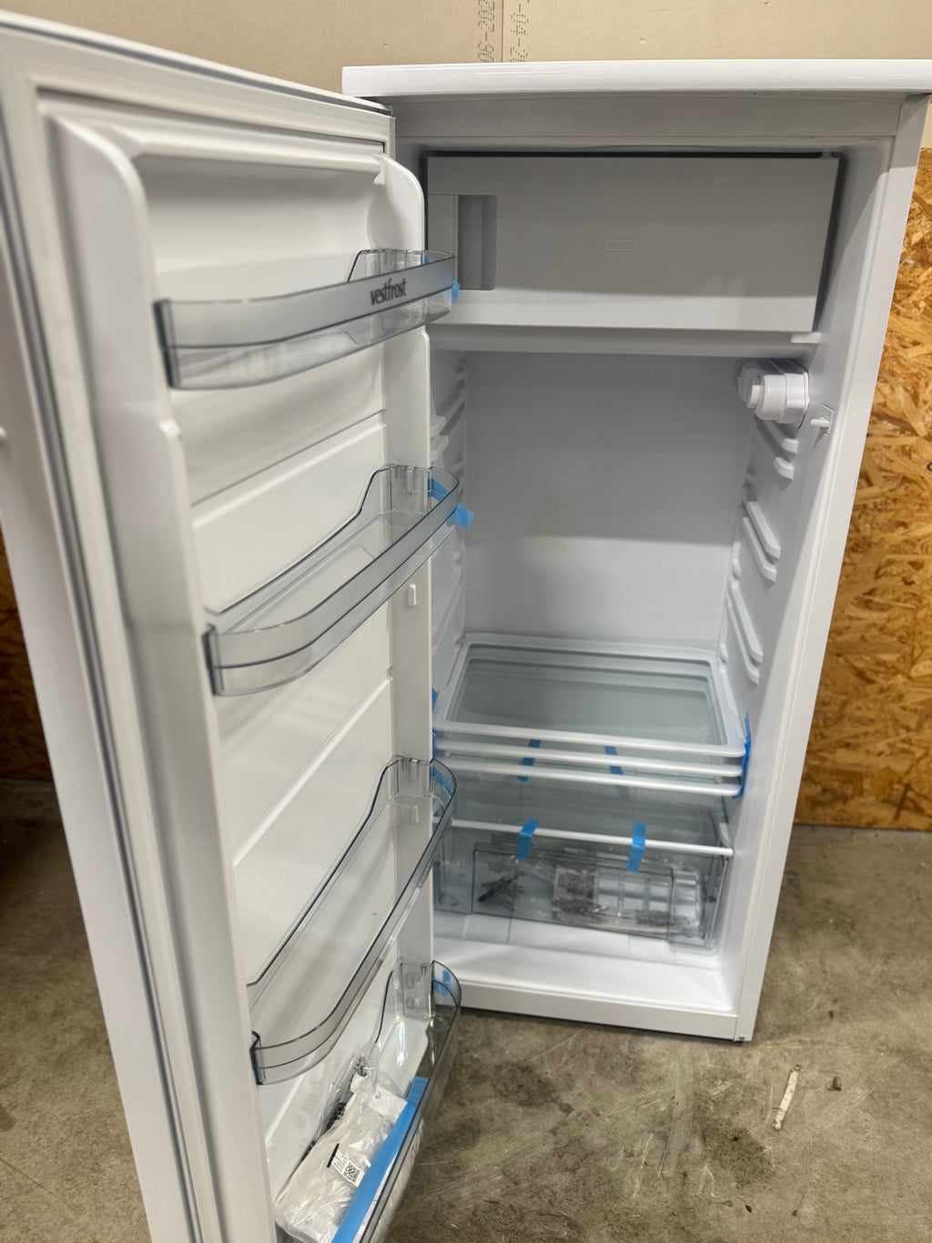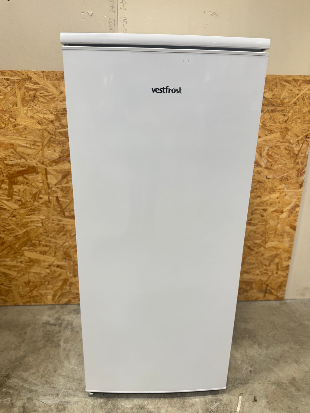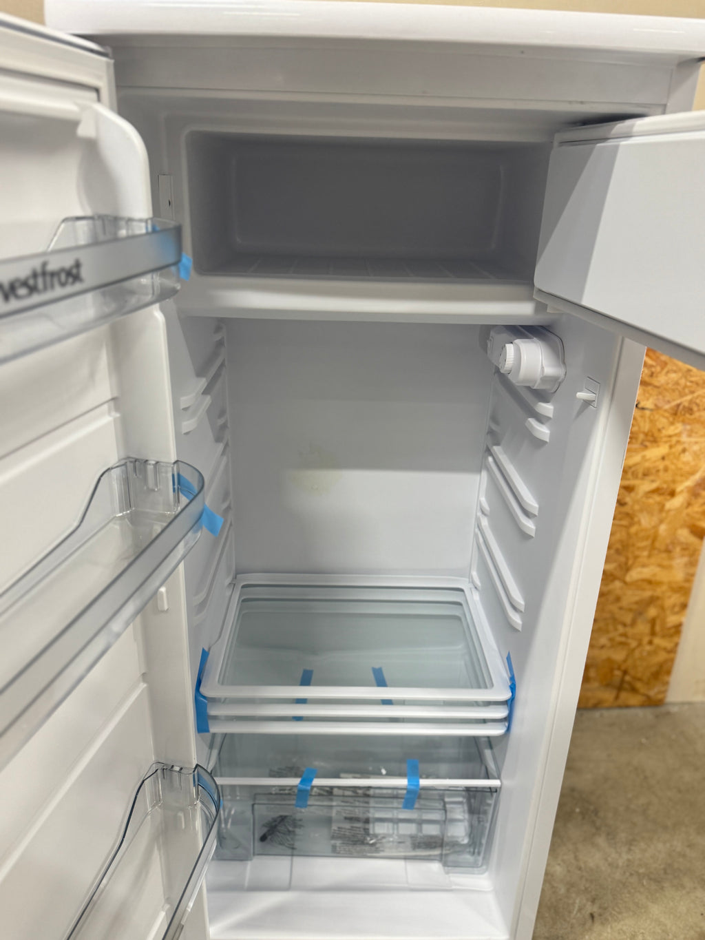 Ubrugt køle/fryseskab med 24 mdr. garanti – Ubrugt Vestfrost køle/fryseskab med 170 ltr. køle- og  17 ltr. frysekapacitet. Et helt nyt lækkert køleskab til den mindre husstand, kolonihaven eller som ekstra skab i kælderen. Bemærk: Har fået en bule bagerst på venstre side og 2 små ridser på fronten - ses 2 sidste billeder!!. Du er altid velkommen til at besigtige produkterne på vores lager i Glostrup inden køb.