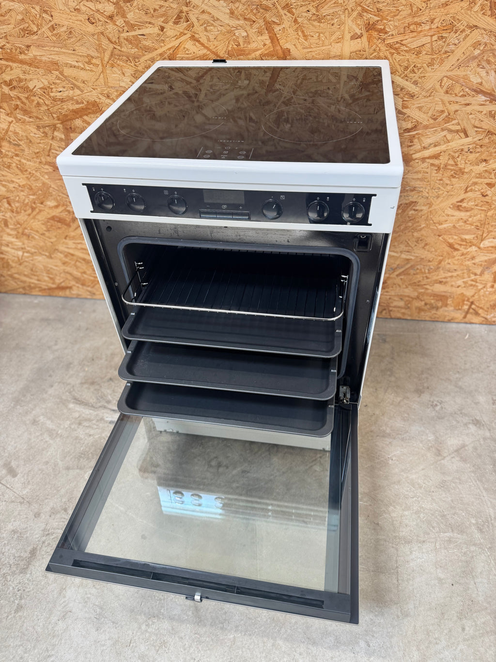 Brugt komfur med 24 mdr. garanti: brugt Voss induktionskomfur i hvidt design med stor ovn på 74 ltr. Et rigtig flot induktionskomfur med få brugsspor. Du er altid velkommen til at besigtige produktet på vores lager i Glostrup inden køb