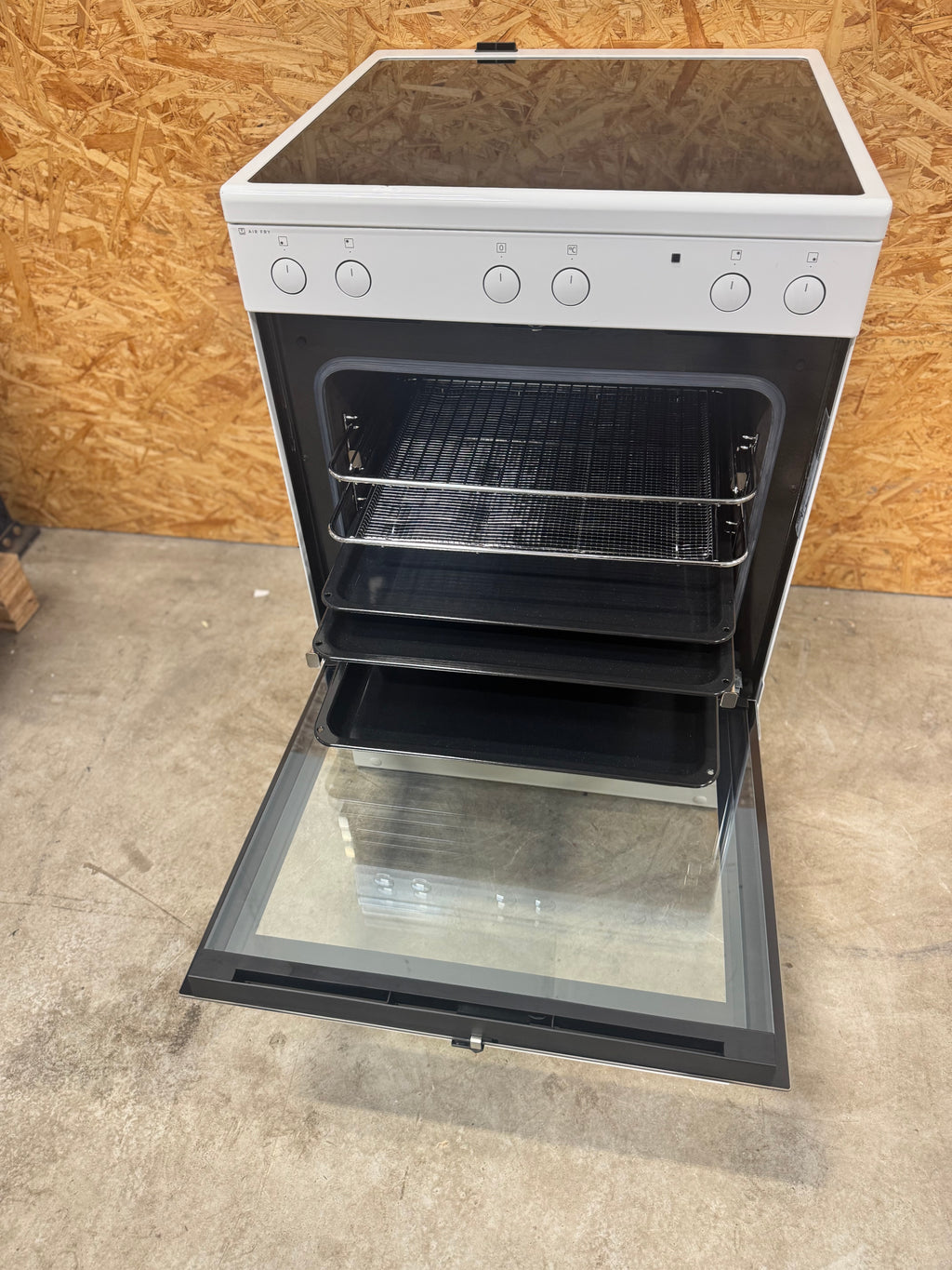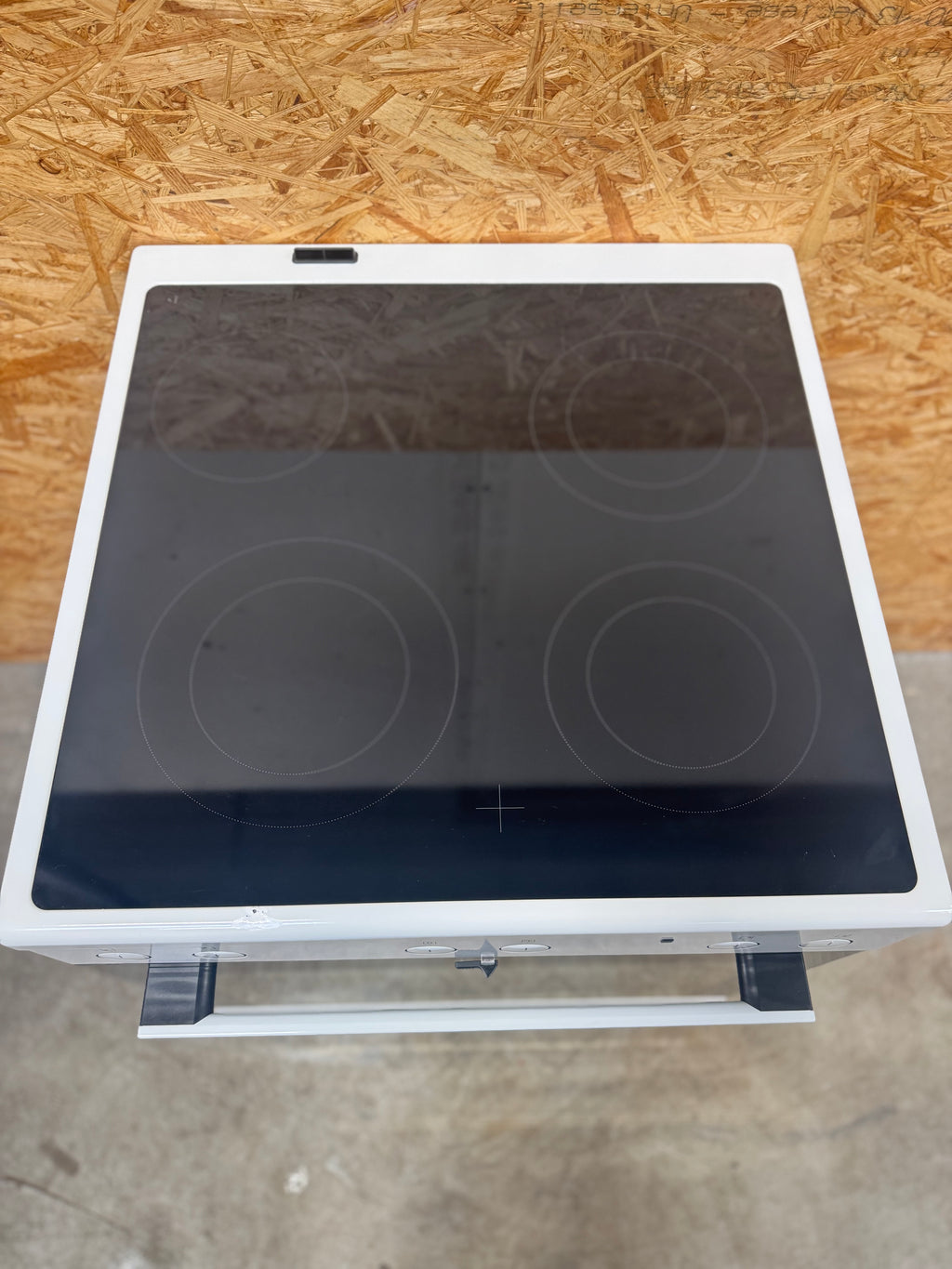 Glaskeramisk komfur 60 cm. med katalyse delvis selvrens: Hvidt glaskeramisk komfur med 4 zoner, heraf 3 dobbeltzoner. Komfuret har rengøringsvenlige pop-ud knapper og ovnen har katalytisk selvrens. Stort ovnrum med markedets største bageplader, praktisk magasinskuffe til opbevaring af ovntilbehør samt udtræk i 2 niveauer.