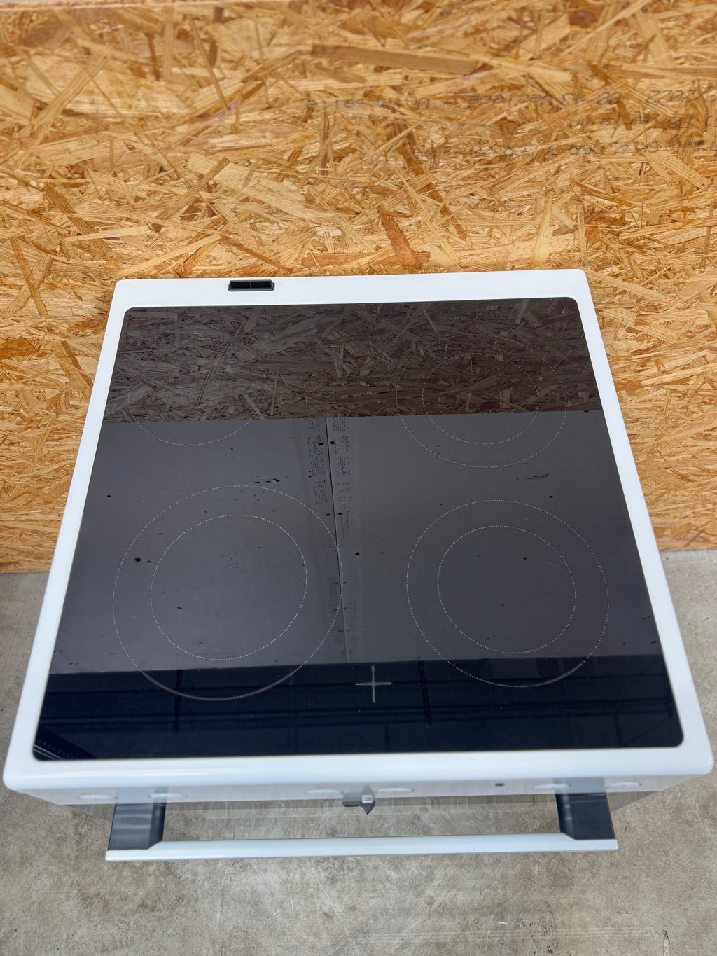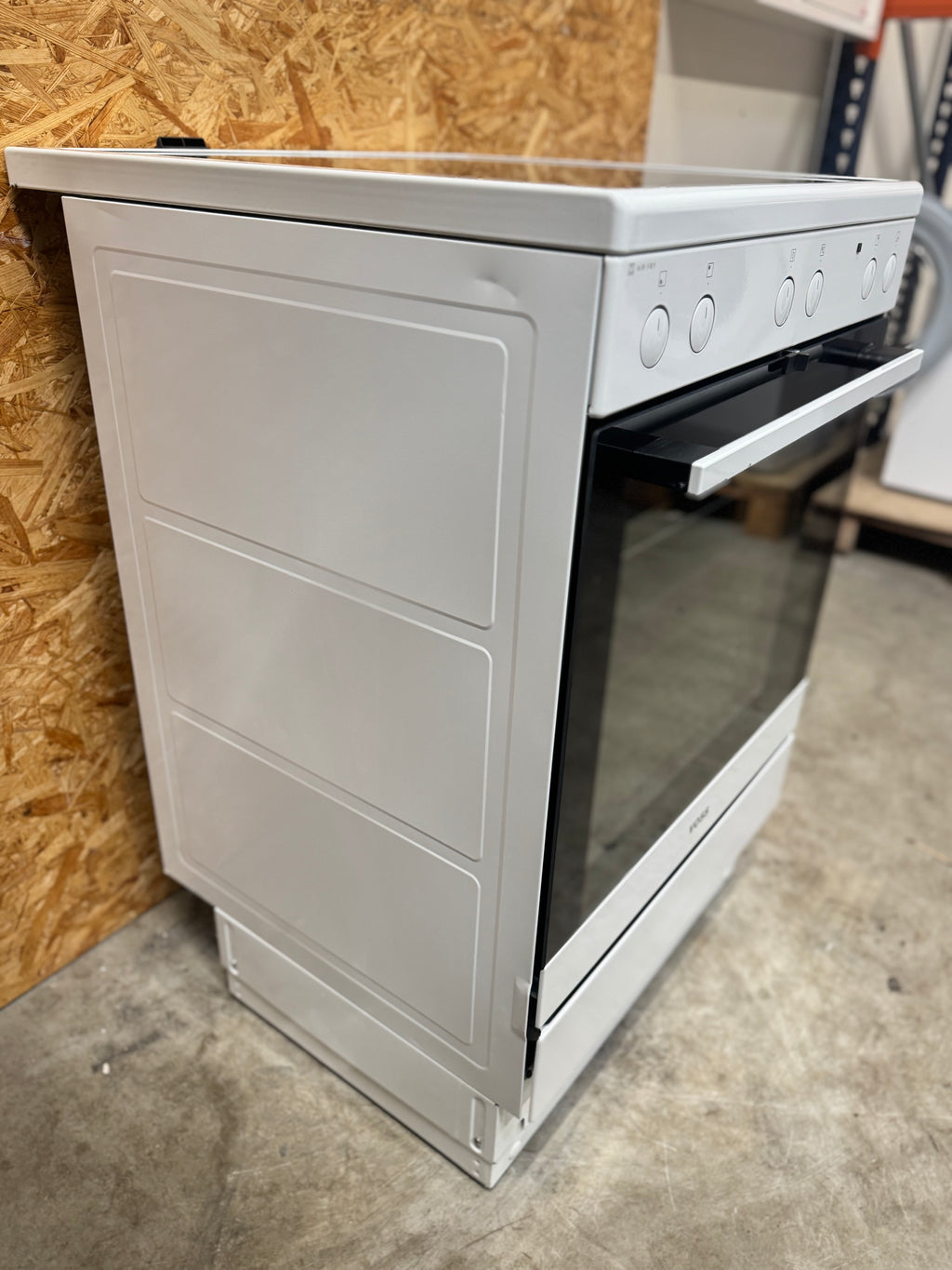 Glaskeramisk komfur 60 cm. med katalyse delvis selvrens: Hvidt glaskeramisk komfur med 4 zoner, heraf 3 dobbeltzoner. Komfuret har rengøringsvenlige pop-ud knapper og ovnen har katalytisk selvrens. Stort ovnrum med markedets største bageplader, praktisk magasinskuffe til opbevaring af ovntilbehør samt udtræk i 2 niveauer.